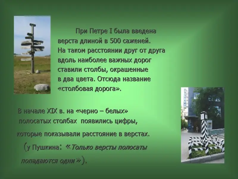 34 слайд. При Петре I была введена верста длиной в 500 саженей. На таком расстоянии друг от друга вдоль наиболее важных дорог ставили столбы, окрашенные в два цвета. Отсюда название "столбовая дорога".