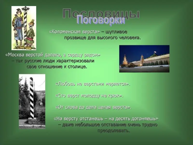 35 слайд. "Коломенская верста" - шутливое прозвище для высокого человека. "Москва верстой далека, а сердцу рядом" - так русские люди характеризовали свое отношение к столице."Любовь не верстами меряется". "Сто верст молодцу не крюк". "От слова до дела целая верста". "На версту отстанешь - на десять догоняешь" - даже небольшое отставание очень трудно преодолевать.