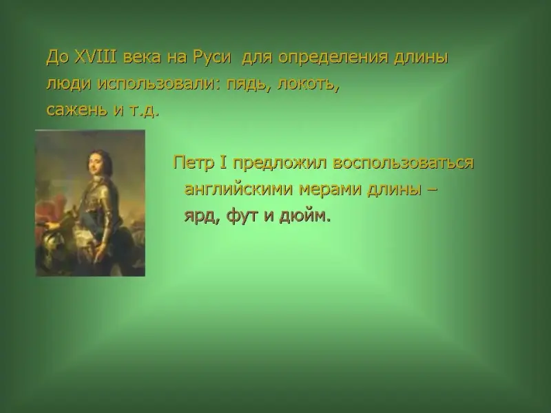 36 слайд. До XVIII века на Руси для определения длины люди использовали: пядь, локоть, сажень и т.д. Петр I предложил воспользоваться английскими мерами длины - ярд, фут и дюйм.