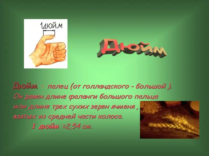 37 слайд. Дюйм - палец (от голландского - большой ). Он равен длине фаланги большого пальца или длине трех сухих зерен ячменя, взятых из средней части колоса. 1 дюйм = 2,54 см.