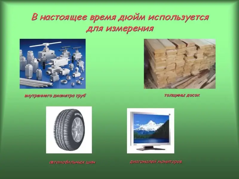 38 слайд. В настоящее время дюйм используется для измерения: внутреннего диаметра труб, автомобильных шин, толщины досок, диагоналей мониторов.