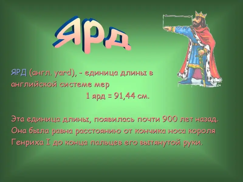 39 слайд. ЯРД (англ. yard), - единица длины в английской системе мер 1 ярд = 91,44 см. Эта единица длины, появилась почти 900 лет назад. Она была равна расстоянию от кончика носа короля Генриха I до конца пальцев его вытянутой руки.