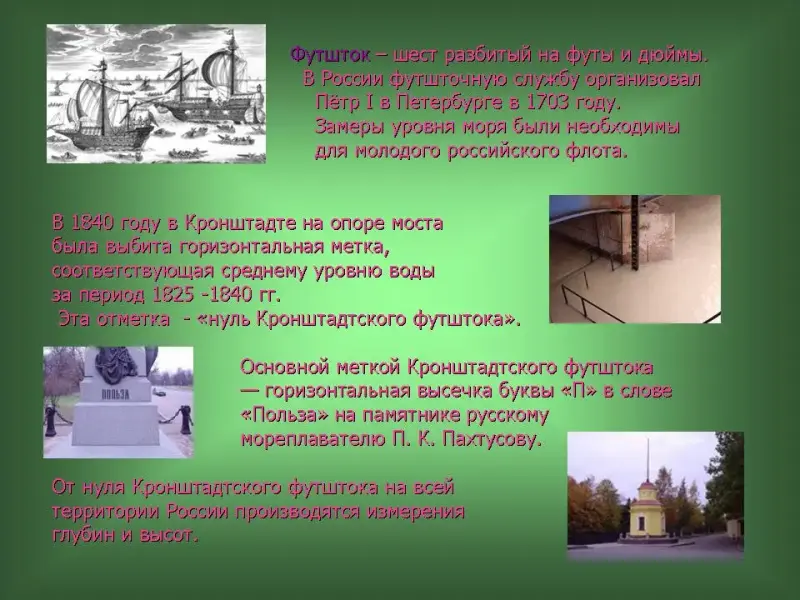 41 слайд. Футшток - шест разбитый на футы и дюймы. В России футшточную службу организовал Пётр I в Петербурге в 1703 году. Замеры уровня моря были необходимы для молодого российского флота. В 1840 году в Кронштадте на опоре моста была выбита горизонтальная метка, соответствующая среднему уровню воды за период 1825-1840 гг.