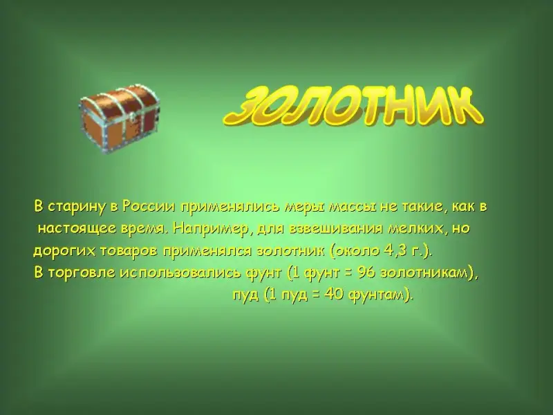 44 слайд. В старину в России применялись меры массы не такие, как в настоящее время. Например, для взвешивания мелких, но дорогих товаров применялся золотник (около 4,3 г.). В торговле использовались фунт (1 фунт = 96 золотникам), пуд (1 пуд = 40 фунтам).