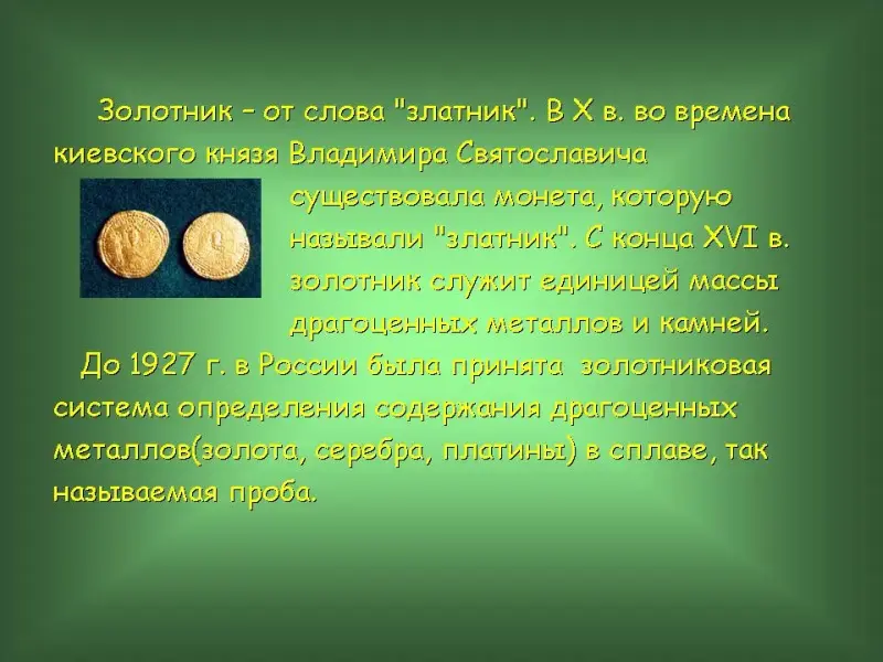 45 слайд. Золотник - от слова "златник". В X в. во времена киевского князя Владимира Святославича существовала монета, которую называли "златник". С конца XVI в. золотник служит единицей массы драгоценных металлов и камней.