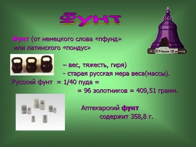 47 слайд. Фунт (от немецкого слова "пфунд" или латинского "пондус"- вес, тяжесть, гиря) - старая русская мера веса(массы). Русский фунт = 1/40 пуда = 96 золотников = 409,51 грамм. Аптекарский фунт содержит 358,8 г.