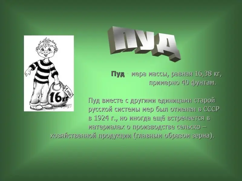 49 слайд. Пуд - мера массы, равная 16,38 кг, примерно 40 фунтам.