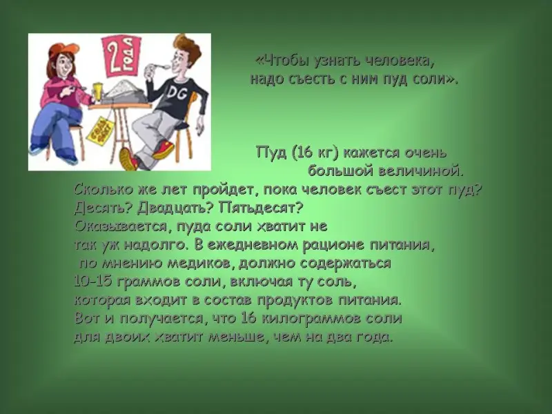 51 слайд. "Чтобы узнать человека, надо съесть с ним пуд соли". Пуд (16 кг) кажется очень большой величиной. Сколько же лет пройдет, пока человек съест этот пуд? Десять? Двадцать? Пятьдесят? Оказывается, пуда соли хватит не так уж надолго. В ежедневном рационе питания, по мнению медиков, должно содержаться 10-15 граммов соли, включая ту соль, которая входит в состав продуктов питания. Вот и получается, что 16 килограммов соли для двоих хватит меньше, чем на два года.