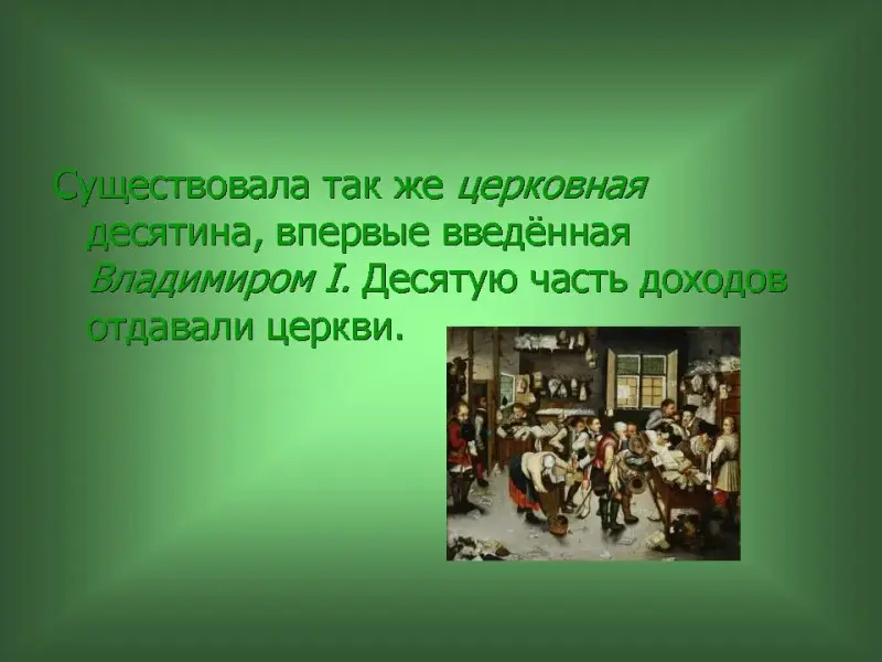 55 слайд. Существовала так же церковная десятина, впервые введённая Владимиром I. Десятую часть доходов отдавали церкви.