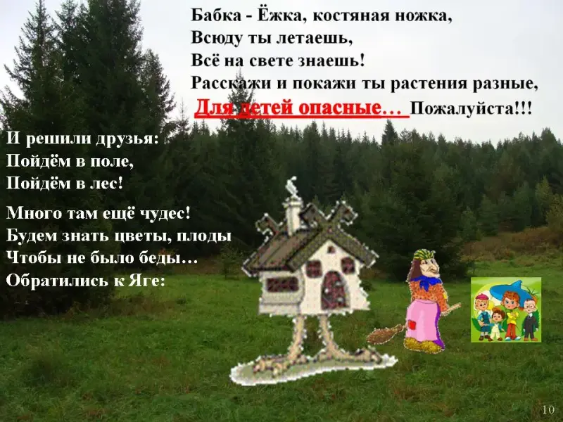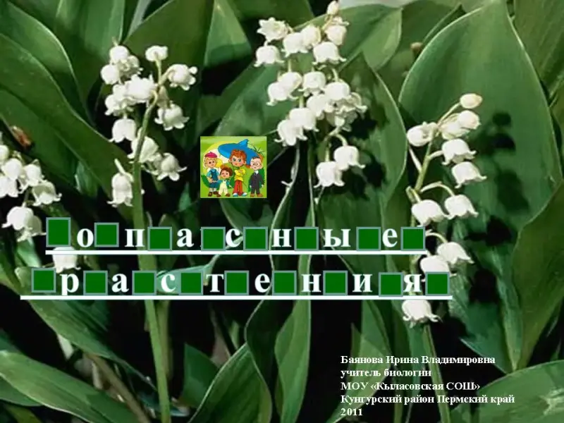 Учитель: Растения в результате химических реакций создают разнообразные вещества, в том числе ядовитые, и поэтому становятся опасными для человека. Для знакомства с этими растениями мы отправимся в путешествие, и помогут нам в этом сказочные персонажи. Внимательно смотрите, названия растений записывайте в тетрадь. Обратите внимание на признаки отравления и постарайтесь запомнить меры первой помощи.