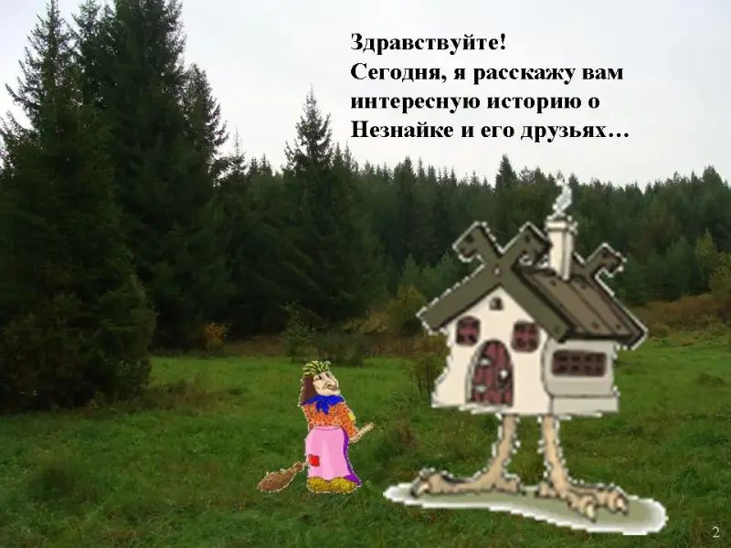 Слайд 2. Появляется Баба Яга: "Здравствуйте! Сегодня, я расскажу вам интересную историю о Незнайке и его друзьях"