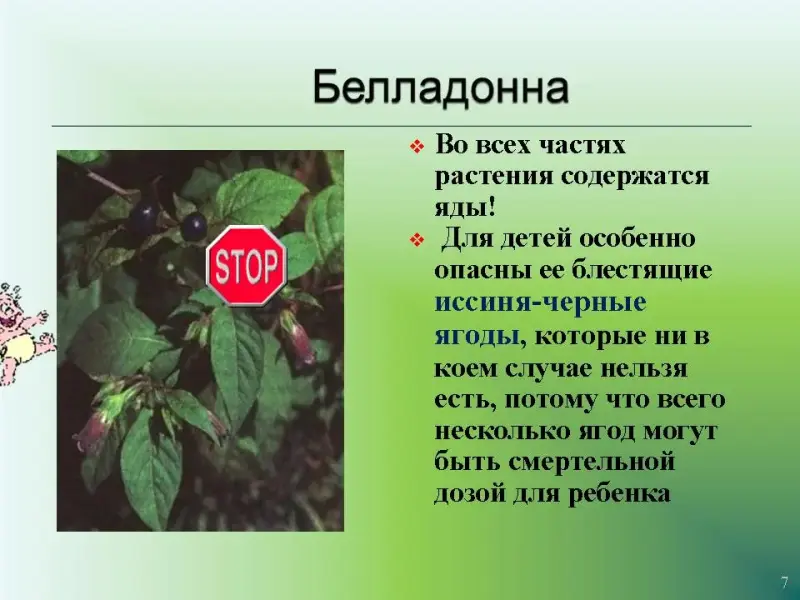 Слайд 7. Белладонна. Во всех частях растения содержатся яды! Для детей особенно опасны её блестящие иссиня- чёрные ягоды, которые ни в коем случае нельзя есть, потому что всего несколько ягод могут быть смертельной дозой для ребёнка.
