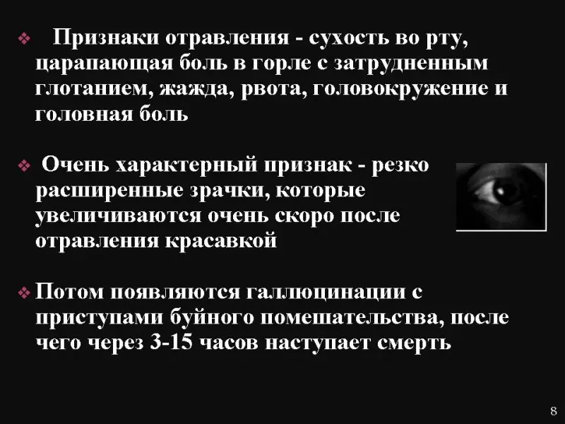 Слайд 8. Признаки отравления - сухость во рту, царапающая боль в горле с затруднённым глотанием, жажда, рвота, головокружение и головная боль. Очень характерный признак - резко расширенные зрачки, которые увеличиваются очень скоро после отравления красавкой. Потом появляются галлюцинации с приступами буйного помешательства, после чего через 3-15 часов наступает смерть