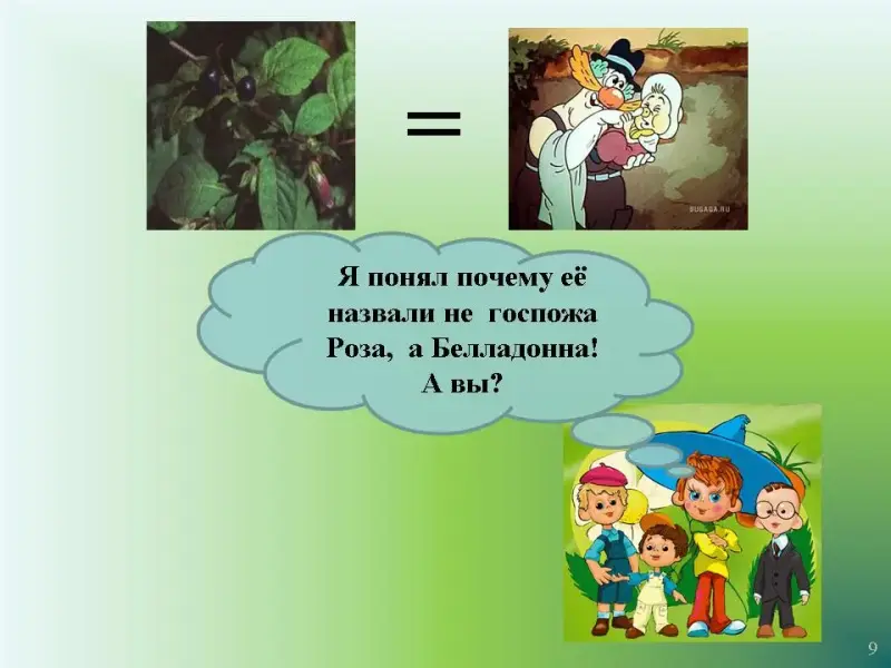 Слайд 9. На слайде знак равенства между двумя картинками с изображением растения белладонны и госпожи Белладонны. Незнайка говорит: "Я понял, почему её назвали не госпожа Роза, а Белладонна, а вы?".