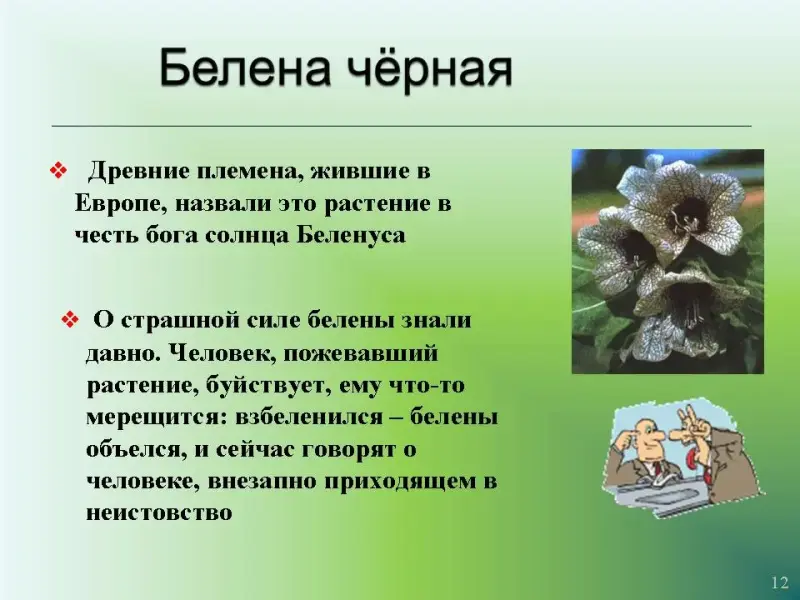 Слайд 12. Белена чёрная. Древние племена, жившие в Европе, назвали это растение в честь бога солнца Беленуса. О страшной силе белены знали давно. Человек, пожевавший растение, буйствует, ему что-то мерещится: взбеленился - белены объелся, и сейчас говорят о человеке, внезапно приходящем в неистовство.