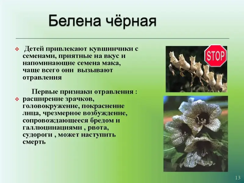 Слайд 13. Белена чёрная. Детей привлекают кувшинчики с семенами, приятные на вкуси напоминающие семена мака, чаще всего они вызывают отравления. Первые признаки отравления: расширение зрачков, головокружение, покраснение лица, чрезмерное возбуждение, сопровождающееся бредом и галлюцинациями, затем рвота, судороги и может наступить смерть.