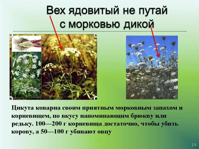 Слайд 14.Вех ядовитый не путай с морковью дикой. Цикута коварна своим приятным морковным запахом и корневищем, по вкусу напоминающим брюкву или редьку. 100-200 г корневища достаточно, чтобы убить корову, а 50-100 г убивают овцу.