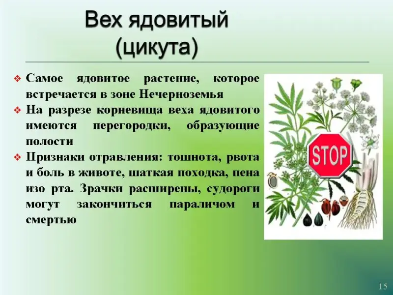 Слайд 15. Вех ядовитый (цикута).Самое ядовитое растение, которое встречается в зоне Нечерноземья. На разрезе корневища веха ядовитого имеются перегородки, образующие полости. Признаки отравления: тошнота, рвота и боль в животе, шаткая походка, пена изо рта. Зрачки расширены, судороги могут закончиться параличом и смертью.