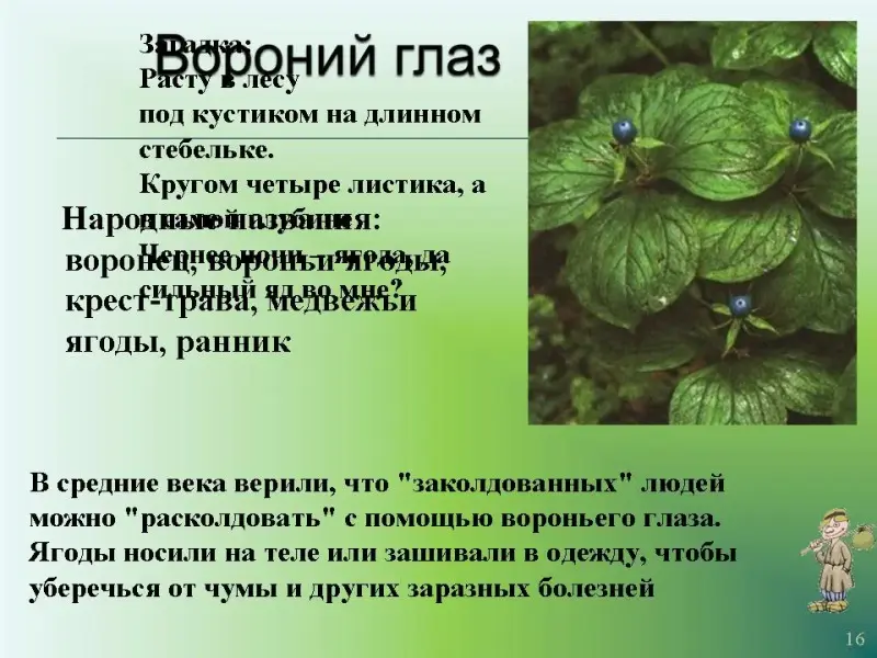 Слайд 16. Вороний глаз. Загадка: