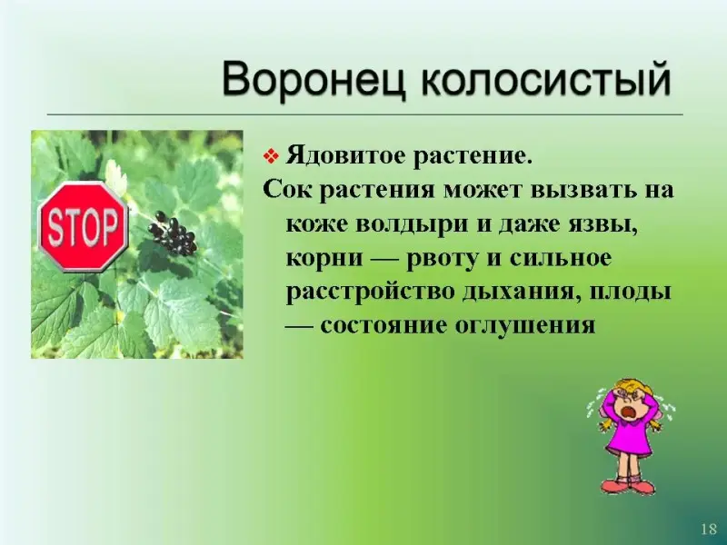 Слайд 18. Воронец колосистый. Ядовитое растение.Сок растения может вызвать на коже волдыри и даже язвы, корни - рвоту и сильное расстройство дыхания, плоды - состояние оглушения.