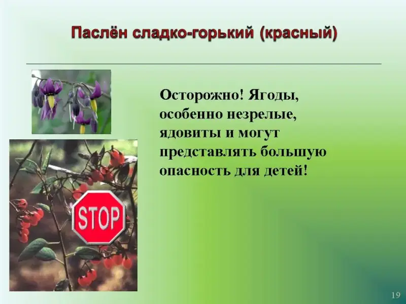 Слайд 19. Паслён сладко - горький (красный). Осторожно! Ягоды, особенно незрелые, ядовиты и могут представлять большую опасность для детей!
