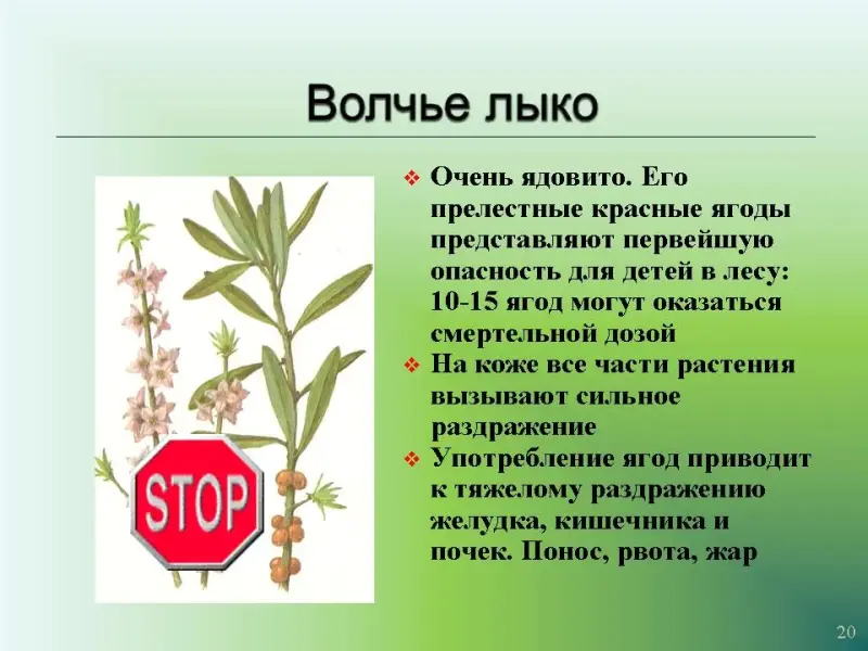 Слайд 20. Волчье лыко. Очень ядовито. Его прелестные красные ягоды представляют первейшую опасность для детей в лесу: 10-15 ягод могут оказаться смертельной дозой.