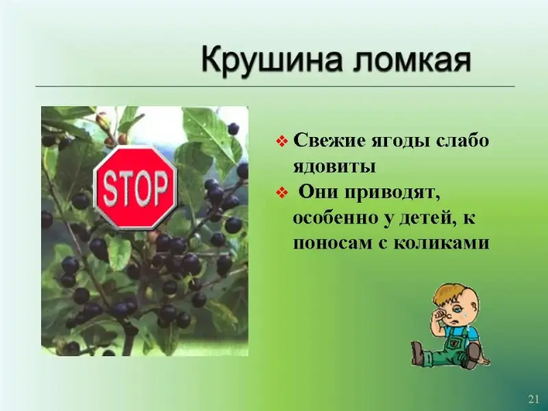 Слайд 21. Крушина ломкая. Свежие ягоды слабо ядовиты. Они приводят, особенно у детей, к поносам с коликами.