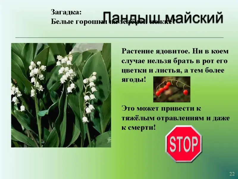 Слайд 22. Загадка: Белые горошки на зелёной ножке? Ландыш майский.