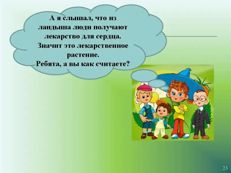 Слайд 23.Незнайка: "А я слышал, что из ландыша люди получают лекарство для сердца. Значит это лекарственное растение. Ребята, а вы как считаете?" Обсуждение информации о том, что растение может быть и ядовитым и лекарственным. Из многих ядовитых растений человек научился получать лекарства.