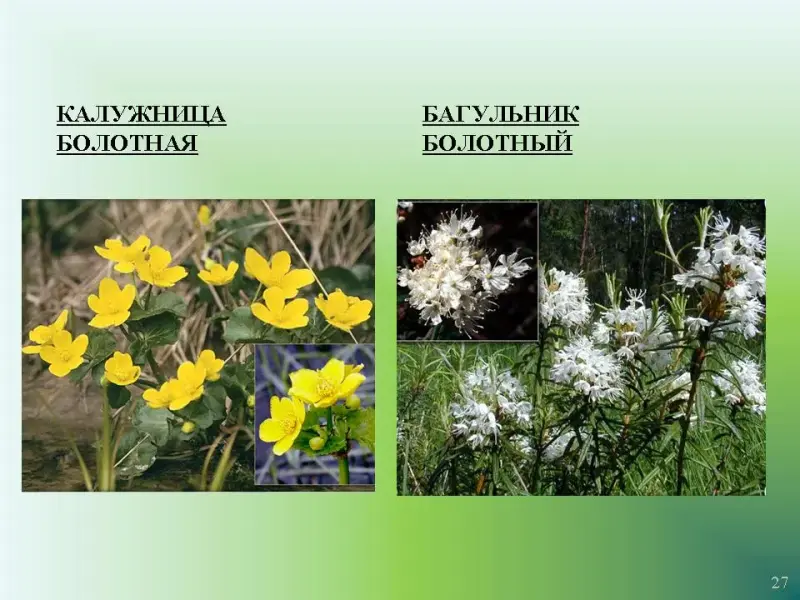 Слайд 27. Калужница болотная. Багульник болотный.