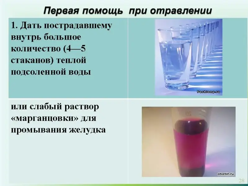 1. Дать пострадавшему внутрь большое количество (4-5 стаканов) теплой подсоленной воды или слабый раствор "марганцовки" для промывания желудка.