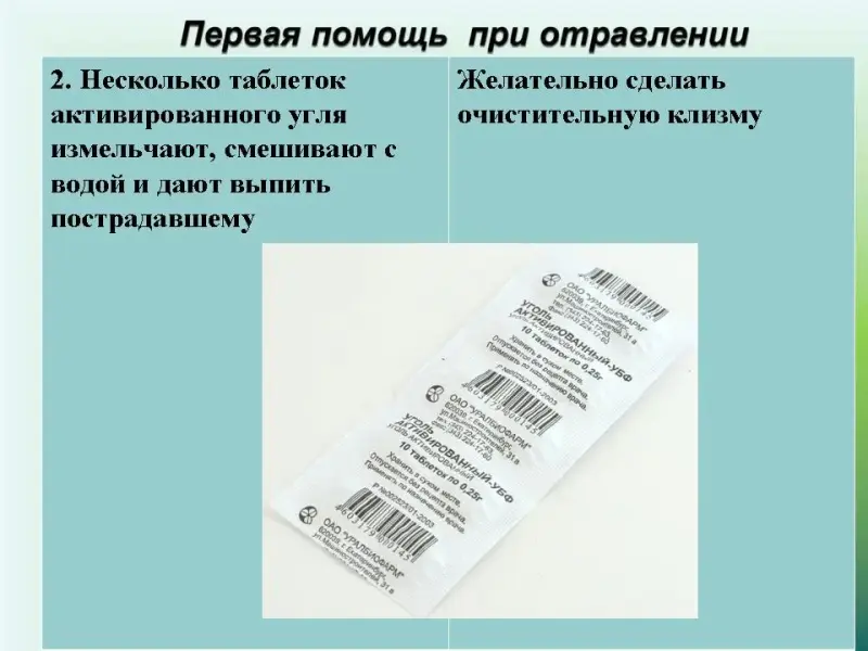 2. Несколько таблеток активированного угля измельчают, смешивают с водой и дают выпить пострадавшему. Желательно сделать очистительную клизму.