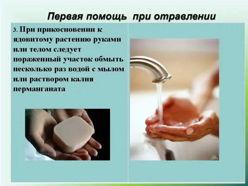 При прикосновении к ядовитому растению руками или телом следует пораженный участок обмыть несколько раз водой с мылом или раствором калия перманганата