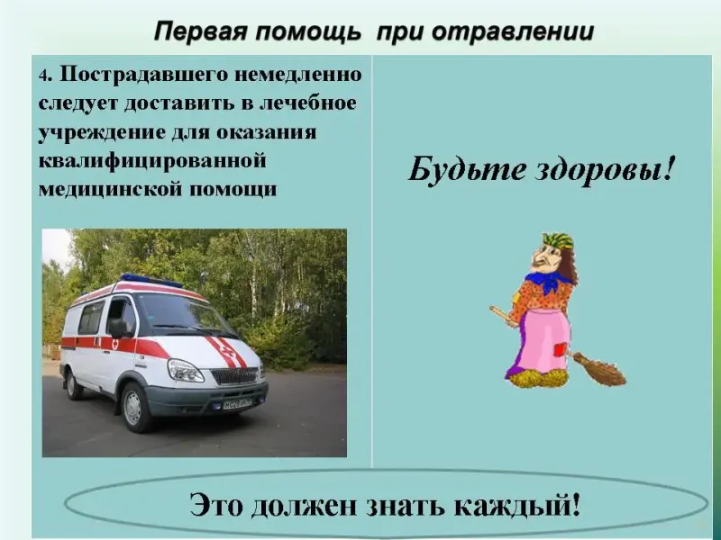 Слайд 31. Первая помощь при отравлении.