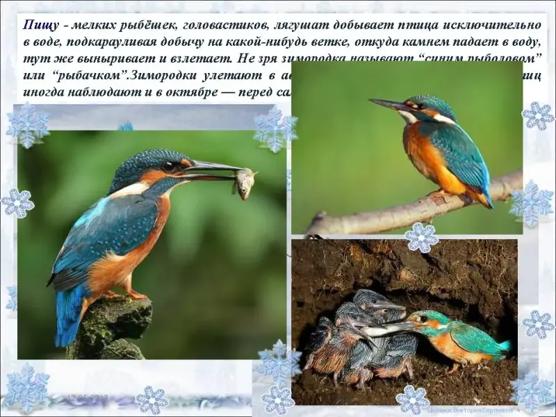 Зимородок - это удивительно красивая птица. Он немного крупнее воробья с необычайно ярким оперением. Верх тела его зеленовато-голубой, брюшко же - огненно-рыжее. Гнездится зимородок по береговым обрывам в норах глубиной до 2 м. Пищу - мелких рыбёшек, головастиков, лягушат добывает птица исключительно в воде, подкарауливая добычу на какой-нибудь ветке, откуда камнем падает в воду, тут же выныривает и взлетает. Не зря зимородка называют "синим рыболовом" или "рыбачком". Зимородки улетают в августе-сентябре, но отдельных птиц иногда наблюдают и в октябре - перед самым ледоставом. А вот в европейской части России зимородков можно увидеть и в студеную пору - возле незамерзающих речных родников и стремнин, где пернатые рыболовы, подобно оляпкам, остаются на зиму.