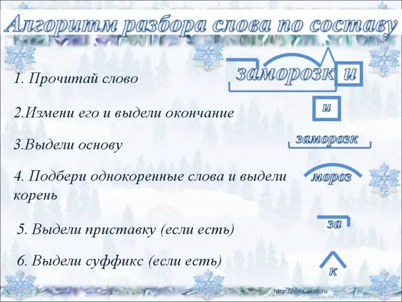 - Я предлагаю вам установить порядок разбора слова по составу, т. е. вывести алгоритм. Вернёмся к нашему слову - заморозки и уже, соблюдая порядок разбора, выделим в нём все его части.