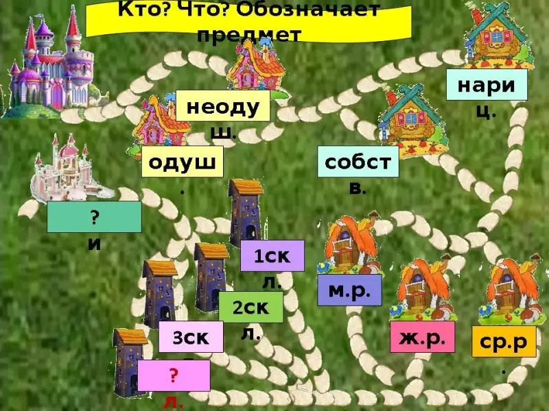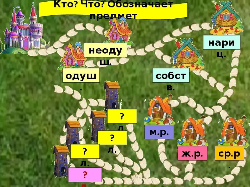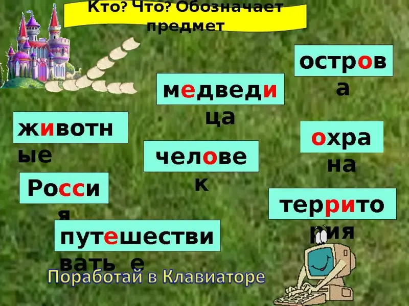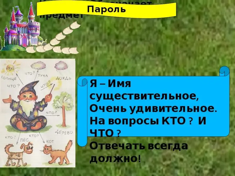 - Итак, чтобы попасть в страну имени существительного, нам надо назвать пароль: вопросы, на которые отвечает имя существительное, и что оно обозначает?