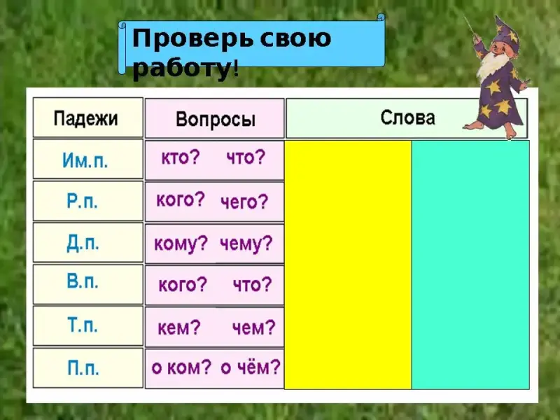 - Что такое склонение? (Это изменение окончаний существительных по вопросам падежей)