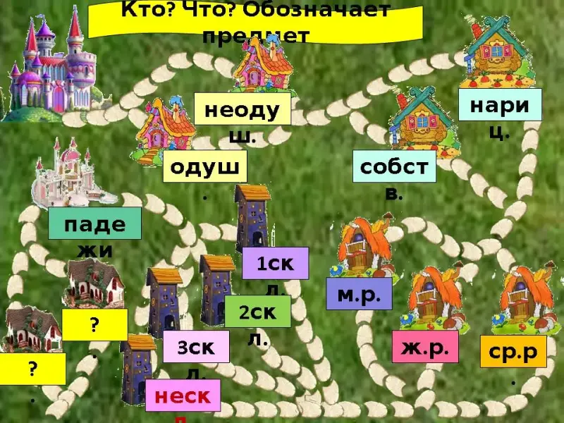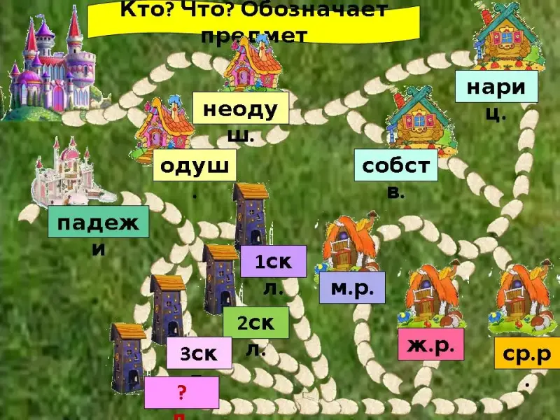 - Дорога наша дальше становится всё запутанней, почему? (Имена сущ. бывают 3 склонений). (Слайд 10 со словами)
