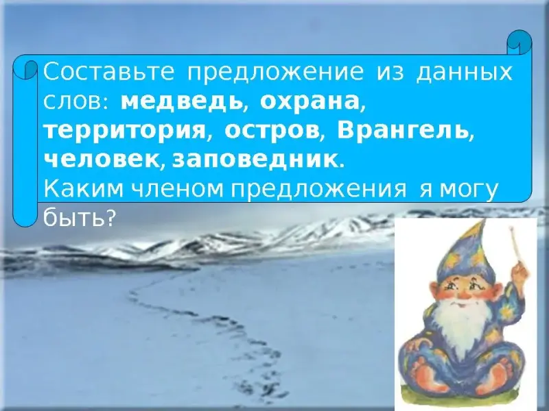 - А теперь давайте составим предложения из слов: медведь, охрана, территория, остров, Врангель, человек, заповедник. (Слайд 20)