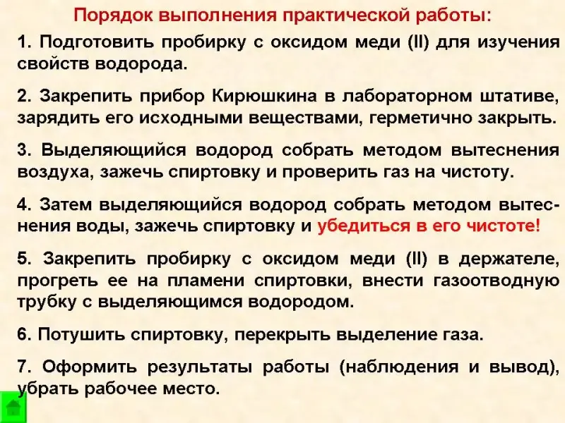 4. Оформить результаты эксперимента: сформулировать и записать наблюдения, вывод (что узнали про газообразное вещество водород на практической работе), сдать тетрадь.