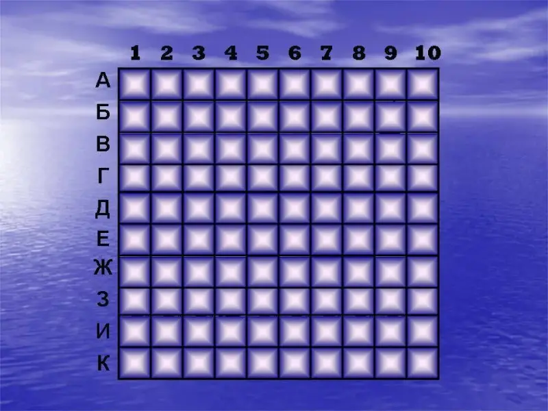 Игровое поле представляет собой квадрат, состоящий из 10 строк и 10 столбцов. Строки обозначены буквами русского алфавита от А до К, а столбцы - арабскими цифрами от 1 до 10.