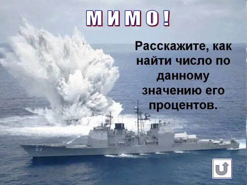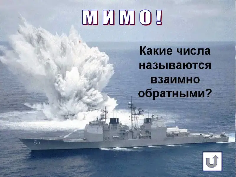В ходе игры ученик делает выстрел (указывает координаты на игровом поле). Если ученик промахнулся, то ему необходимо ответить на вопрос и возможность выстрела переходит к его соседу. Если ученик попадает в корабль, то классу необходимо решить задание. Тот ученик, кто первым справится с заданием, свое решение представляет у доски и будет выполнять следующий выстрел.
