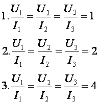 В каждом из случаев напряжение прямо пропорционально силе тока: U ~ I.