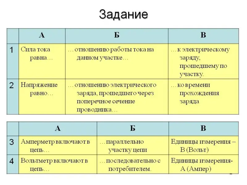 | 4. | Вольтметр включают в цепь… | …последовательно с потребителем. | Единицы измерения - А |