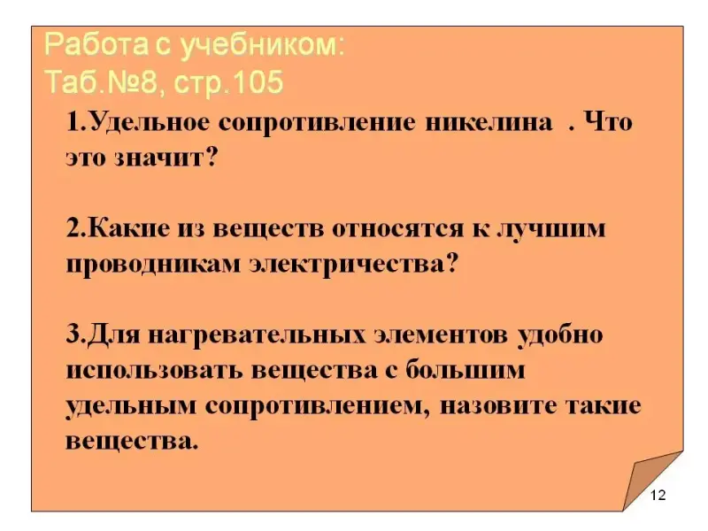 - Для нагревательных элементов удобно использовать вещества с большим удельным сопротивлением, назовите такие вещества нихром, удельное сопротивление никелина