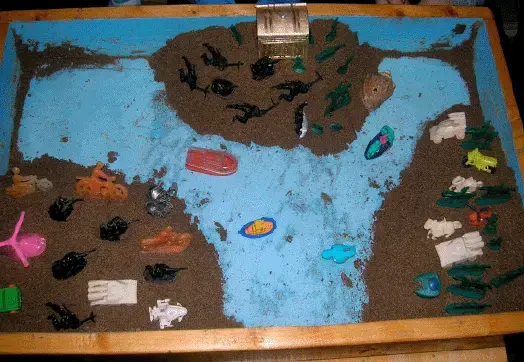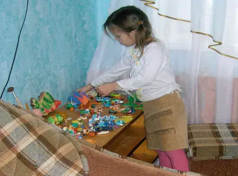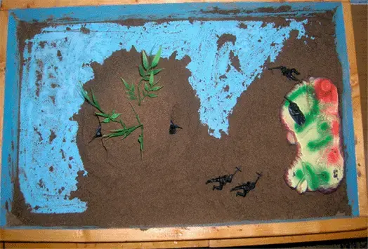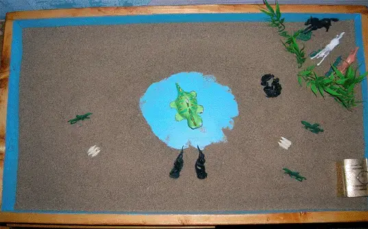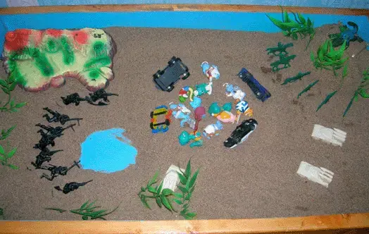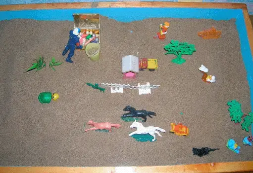В этом возрасте уже можно предлагать строить статичные картины, но понимая, что тяга к игре у ребенка младшего школьного возраста еще велика, можно предложить перестроить картину: "как будет в будущем". Если ребенку необходимо он обыграет эти события, как их обыгрывает дошкольник. Если нет - то он просто переставит персонажей изменив картину на песке.