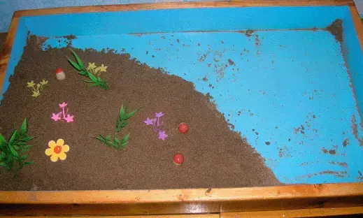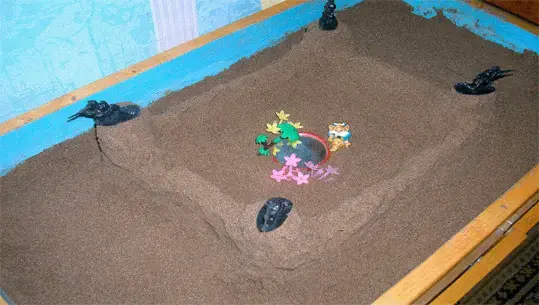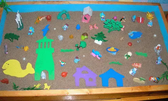 Сама песочница для занятий - обязательно голубого цвета - цвет ясного неба, позитивный и настраивающий на созерцательный и творческий лад. И обязательно прямоугольной формы - она разработана в соответствии с теорией Юнга и должна выглядеть именно так. Песок - мелкий, белый или светло-желтый. Практикуется применение двух песочниц с сухим и сырым песком. Но самое главное - это фигурки. Несколько групп самых разных по цвету, форме и размеру игрушек позволяют ребенку выстроить то, что он пожелает. Причем выбор и построение игрушечных миров у одного и того же малыша в разное время может сильно отличаться - в зависимости от его настроения, самочувствия, взаимоотношений в семье и с окружающими, в том числе, и другими детьми. Обычно используются следующие группы миниатюрных игрушек: