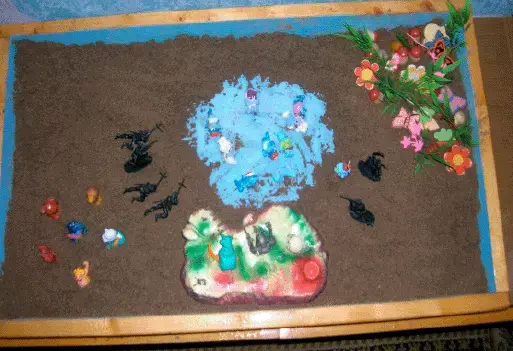 В контексте сказкотерапии мы рассматриваем песочницу, во-первых, как среду для создания сказок и сказочных миров. Давно живущие в душе сказки, которые сложились на события жизни, получают возможность стать увиденными и осязаемыми. Когда ребенок смотрит на фигурки расставленные в песочнице сюжет приходит как бы сам собой. Так развивается способность к сочинению сказок. Что, в свою очередь содействует осмыслению жизненного опыта. Творчество в песочнице, стиль взаимодействия в процессе сказочной страны, это проекция внутреннего мира. Обыгрывая на песке различные жизненные ситуации, ребенок находит решения и претворяет их в жизнь.