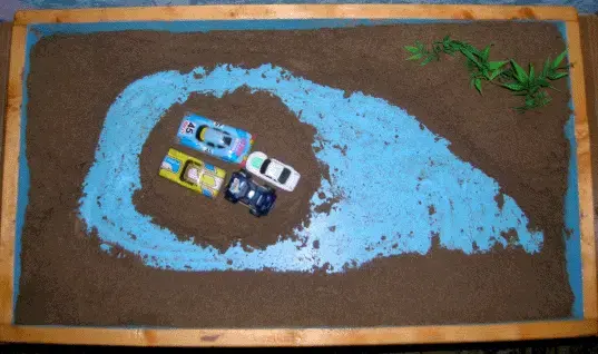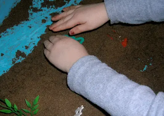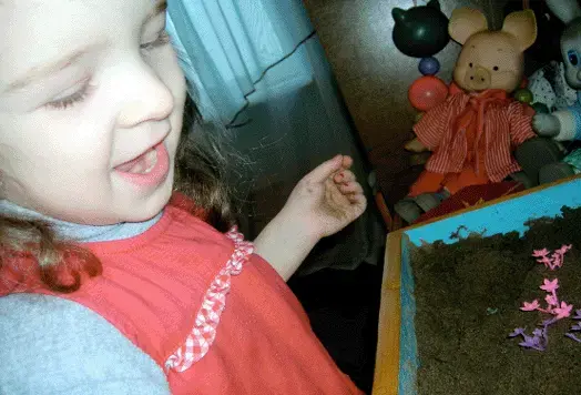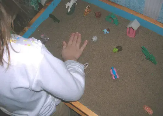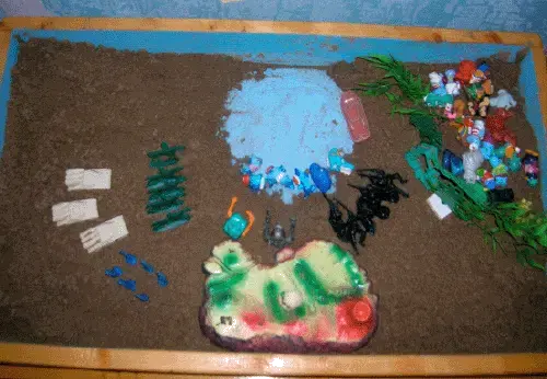 Ведущая деятельность этого возраста - сюжетно-ролевая игра. По этому не стоит требовать от ребенка этого возраста статичной картины на песке. Часто построив картинку он принимается обыгрывать ее, передвигая и переставляя персонажи.